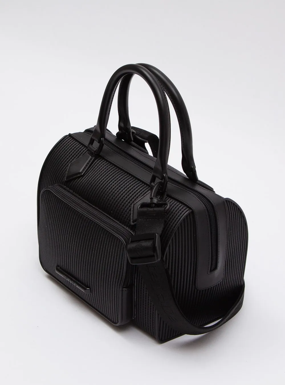 Bolsa shape baú, estruturada com efeito canelado, fechamento por zíper, alça tiracolo de gorgorão e bolso frontal com zíper.